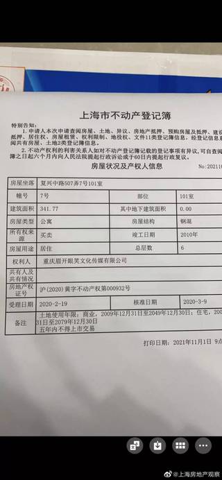 另據《國際金融報》2月7日報道,在2021年11月1日打印的上海市不動產登記簿中發現,該房屋的權利人為重慶眉開眼笑文化傳媒有限公司,正是謝娜名下企業。