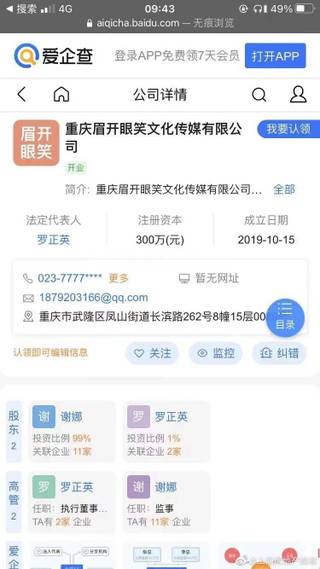 天眼查App顯示,該公司為謝娜關聯公司,成立於2019年10月,法定代表人為羅正英,謝娜持股99%並擔任監事,為疑似實際控制人。