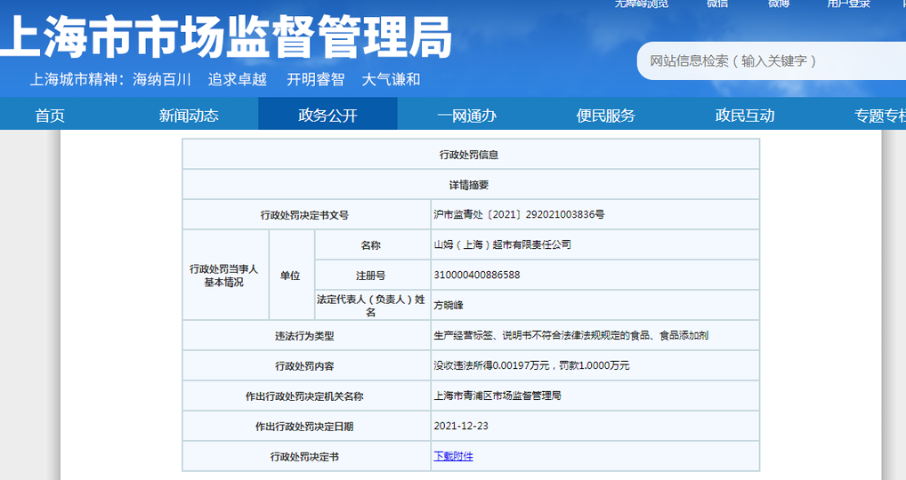 近日,山姆(上海)超市有限責任公司新增一則行政處罰訊息,進口蔬菜未標保質期被罰1萬元人民幣。