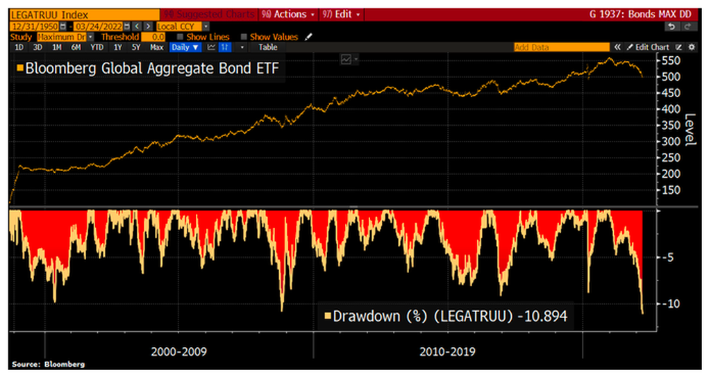 周四,彭博全球債券綜合指數(Bloomberg Barclays Global Aggregate Index)已較去年年初的峰值水平下跌了約11%,不僅一舉邁入逾10%的技術面修正區域,同時也超越了2008年雷曼危機期間10.8%的跌幅,創下了有紀錄以來最大的峰值回撤幅度。該指數涵蓋了全球政府債券、企業債券和證券化債券。