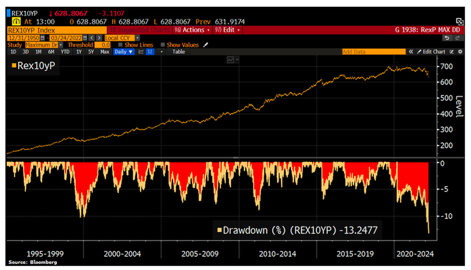 此外,德國的債券基準指數也遭遇了歷史上最大的回撤——自峰值水平下挫了13.3%。