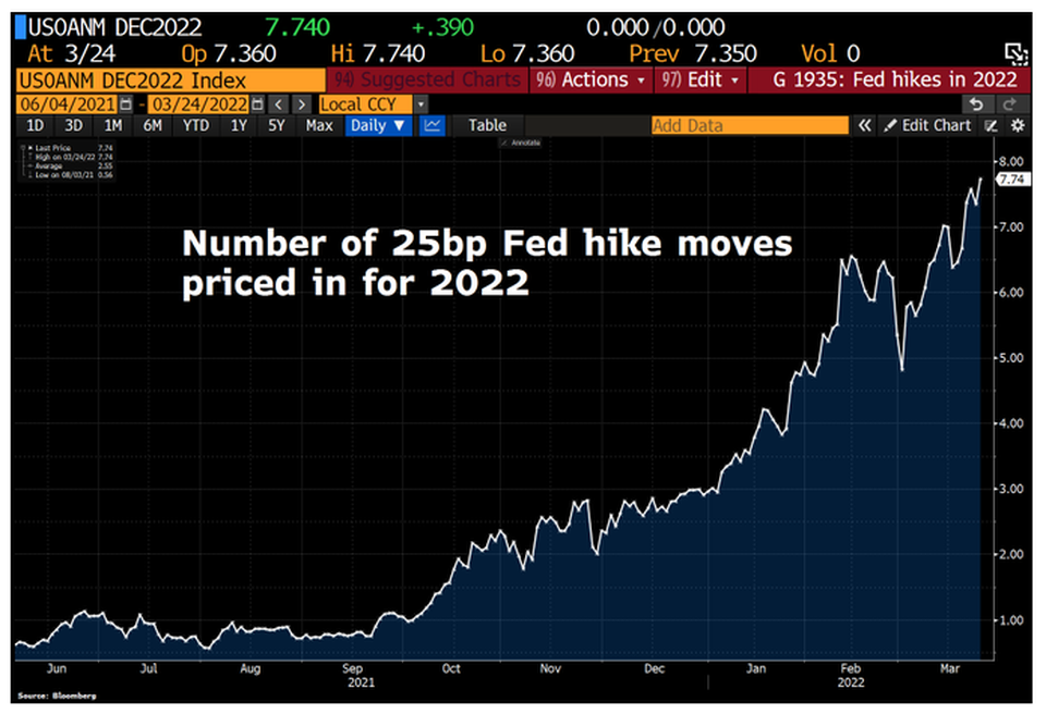 以美聯儲主席鮑威爾為首的聯儲官員們已暗示,該聯儲接下來可能會選擇更大幅度的加息力度。利率掉期市場的數據顯示,交易員們預計美聯儲到今年年底將進行7.74次25個基點的加息,這預示着年內在年內剩下的六次會議上,該聯儲不僅均會加息,而且某次會議上的加息幅度很可能達到50個基點。