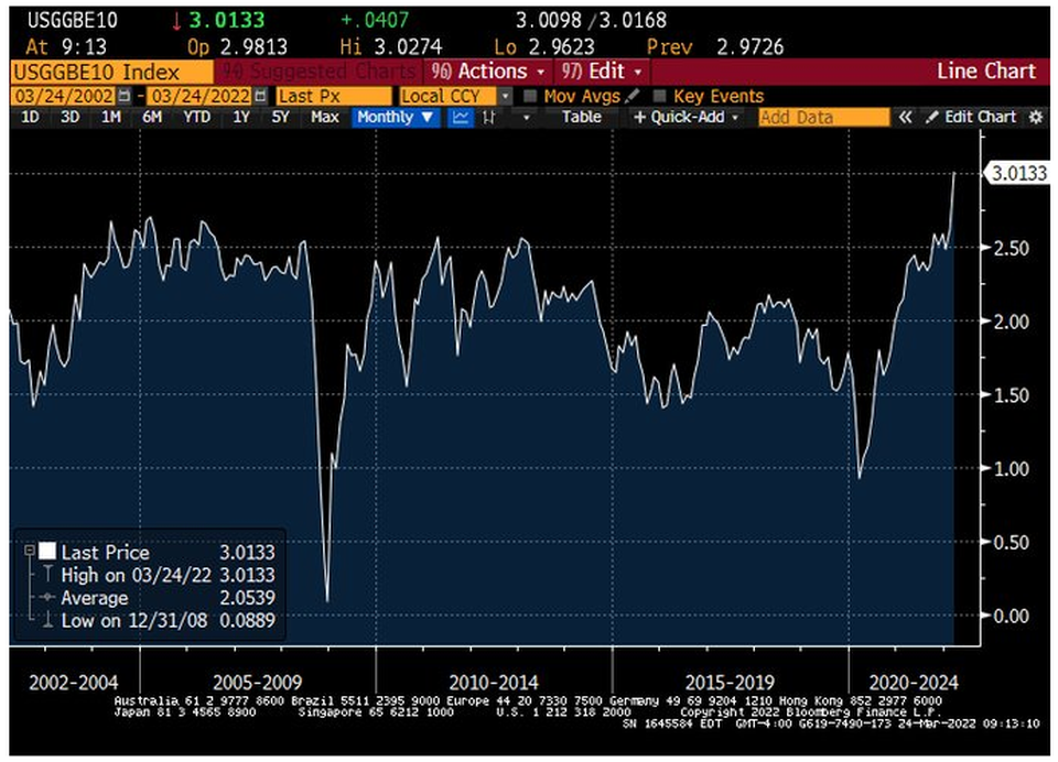 目前,衡量通脹預期的指標10年期TIPS盈虧平衡通脹率在周四已首次升破了3%,顯示市場預計未來10年美國平均年通脹率將超過這一關口。