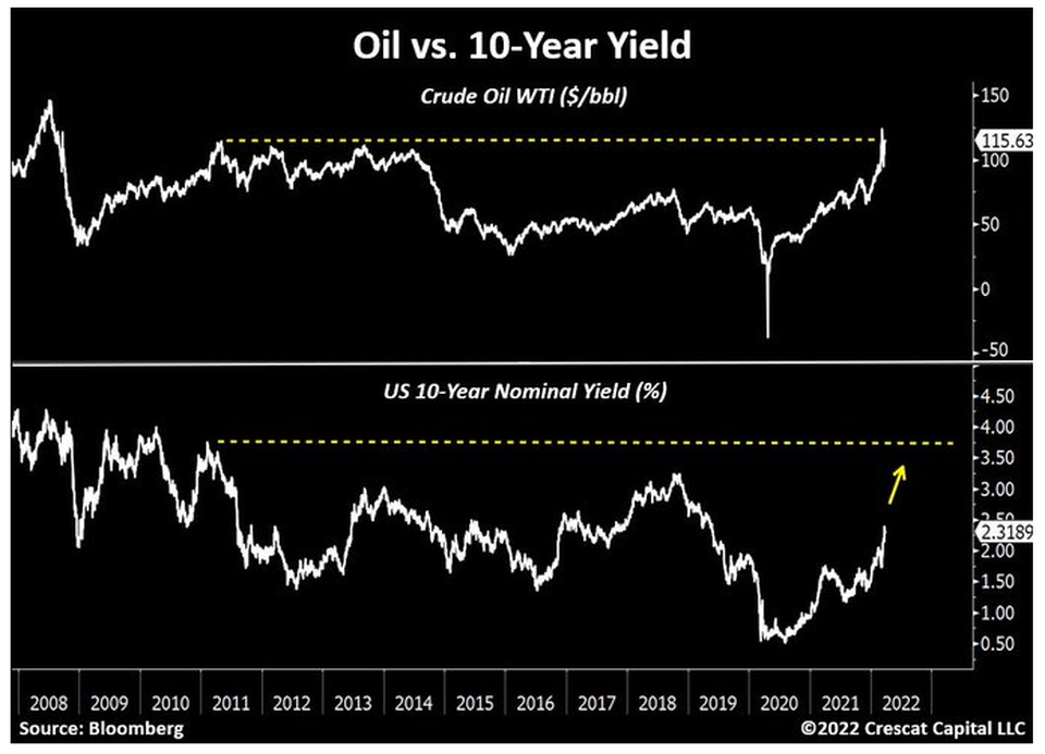 而另一處有意思的對比是,美國WTI原油周四在115美元附近震盪整理,而上一次油價處於如此高位時,指標10年期美債收益率高達3.7%。無論從哪個角度看,當前的債市拋售潮很可能都才剛剛進行到一半。