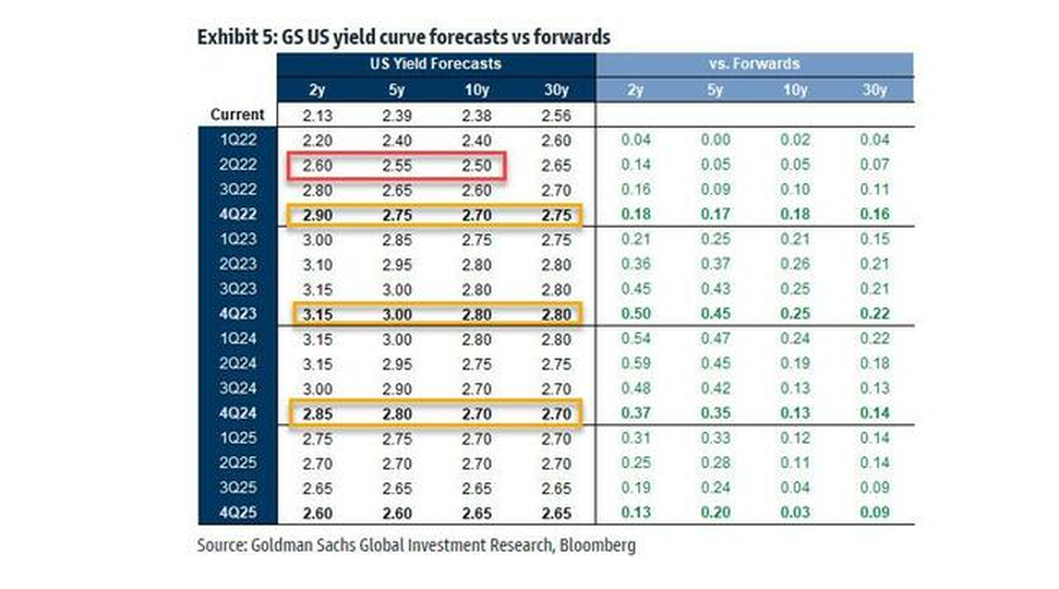 高盛對短債的預測調整更大。該行分析師現在預計2年期美債收益率2022年底將達到2.9%,2023年底將達到3.15%。周四2年期美債收益率最新報約2.147%。