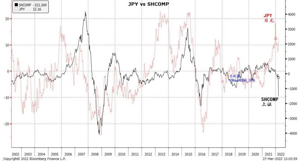 從歷史上看,每當日元的弱勢處於當前或更弱水平之際,上證往往會踟躕不前,或不日觸頂。如果日元疲軟之勢是一種風險偏好指標,且正接近其極限,那麼諸如中國市場等風險資產的價格也將隨之減弱。