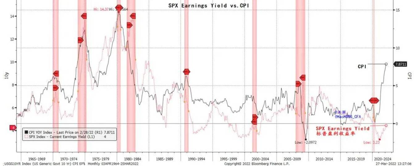圖表5: CPI高企意味着更高的美股盈利收益率,也就是更低的市盈率