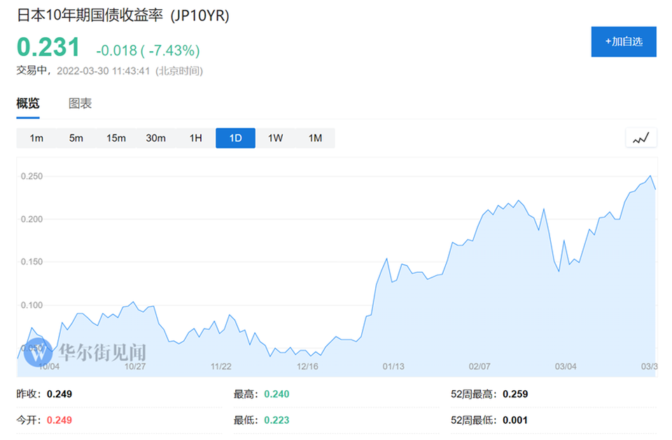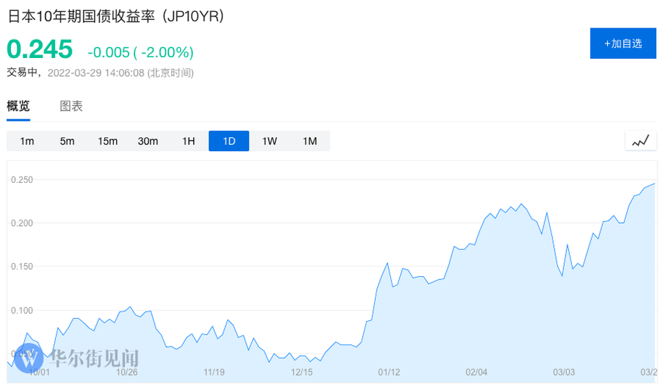 在美聯儲升息影響下,日本國債收益率此前持續上漲,一度攀升至0.245%,觸及日本央行的上限(日本的收益率曲線控制政策旨在將10年期政府債券收益率保持在零附近,並有25個基點的迴旋餘地)。