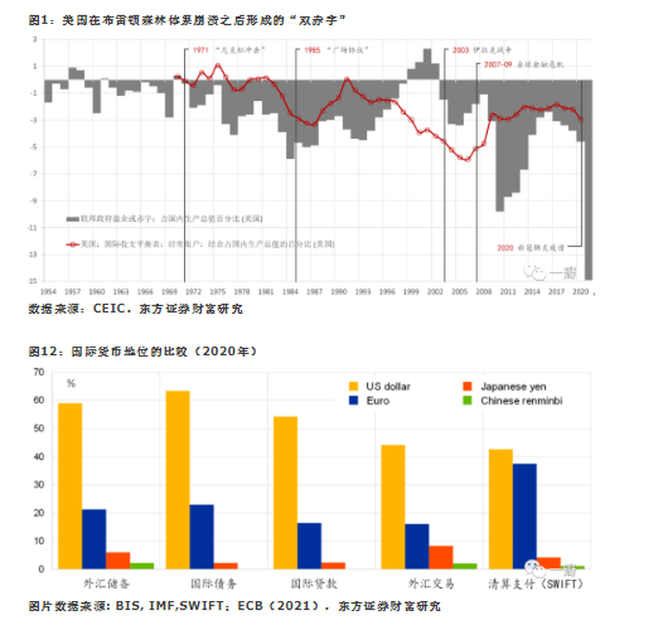 1971年尼克松關閉黃金窗口及其後協議的美元貶值是實質性違約。近半個世紀,美國經濟的部分特徵與一戰(或二戰)之前的英國類似:相對經濟規模下滑;「雙赤字」(財政赤字+經常賬户赤字)規模持續攀升(圖1);以及來自其它國家的競爭或挑戰(美國面對的是德國/歐盟、日本、中國,英國面對的是德國、法國和美國),所以,關於美元霸權衰落的討論是合理的。但截止2021年底,無論是絕對還是相對意義上,美元都是霸權貨幣,其在外匯儲備、債務計價、國際借貸、外匯交易和清算支付中所佔的份額都遙遙領先。一般認為,在外匯儲備中的份額最具代表性——美元佔比為59%,相對於本世紀初下降了約13個百分點,但仍然佔絕對主導地位,領先於排名第二的歐元39個百分點(圖2)。