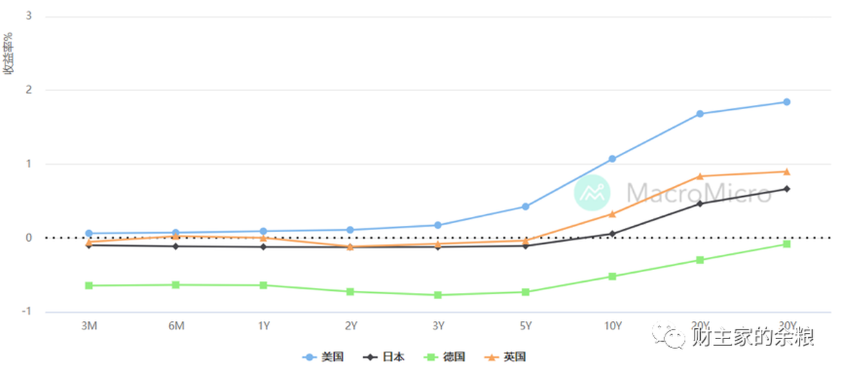 根據期限不同,將這些債券的到期收益率,都畫在一張圖上,這就是某一時點的國債收益率曲線(Yield Curve)。例如,下面這張圖就是2021年1月1日的時候,西方經濟體量最大的四大國家——美國、日本、德國和英國的國債收益率曲線。