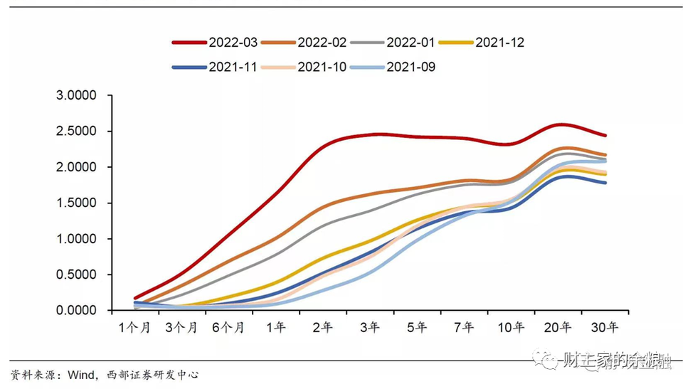 對於同一種貨幣計價的債券來說,不同的時間點,債券收益率曲線都是不相同的。我們這裏以美國國債為例,從2021年9月份到2022年3月份,其每個月的國債收益率曲線,就是下面這幅圖的樣子(「2022-03」是指2022年3月底的收益率曲線,其他標註雷同)。