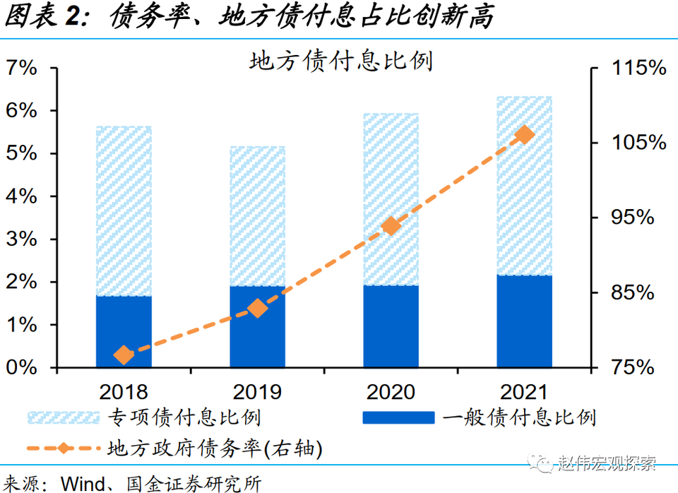 疫情之後,伴隨財政擴張,債務累積加大付息壓力。為應對疫情衝擊,財政刺激規模加碼,2020-2022連續3年地方債額度保持4.3萬億元以上的高增。伴隨財政擴張,地方債務率已攀升至106%,債務付息負擔也明顯加重,其中,2021年一般債付息佔一般預算支出比例抬升至2.2%,專項債付息佔政府性基金支出比例也創新高至4.2%。考慮到部分高成本的隱性債務等,償債壓力或高於以往。