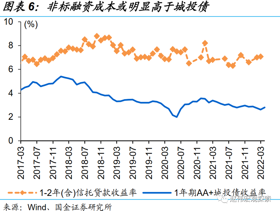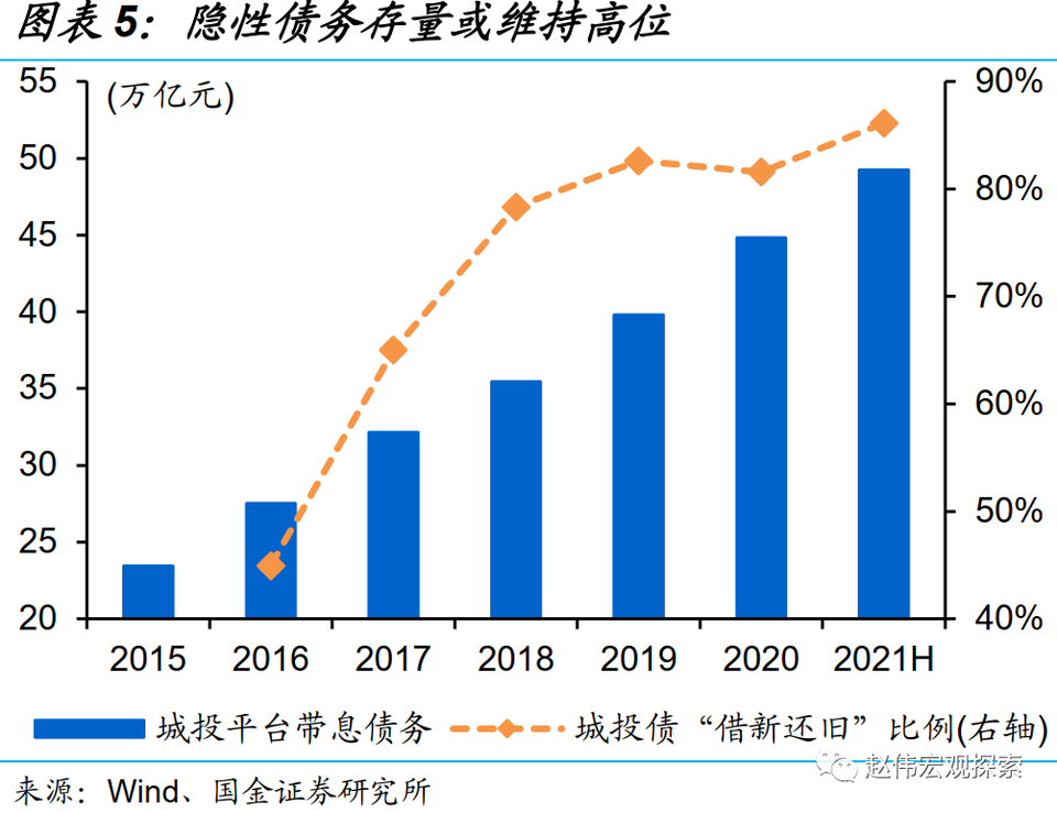 考慮到「隱性」存量債務等,還本付息的壓力或高於以往。截至2021年年中,城投平台帶息債務的存量規模或在49萬億元左右;「隱性」存量債務體量維持高位、融資成本相對較高等因素交織,或進一步加大地方債務壓力、還本付息或高於以往,部分城投債或用於償還非標等高成本債務、2021年年中城投債「借新還舊」比例較2020年抬升4個百分點、創新高至86%。