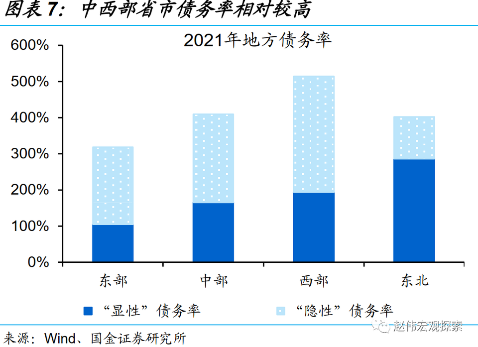 分地區來看,中西部整體債務率相對較高、隱性債務突出,個別東部省市壓力也較大。債務持續累積,地方財力相對弱化,使得地方債務壓力逐步凸顯,尤其是西部、整體債務率高達500%以上、隱性債務突出,其次為中部,東北、東部整體債務率相對較低。具體省市中,中西部雲南、甘肅、貴州等,東部的天津、江蘇等債務率均高於區域平均水平、尤其是隱性債務壓力或較突出。