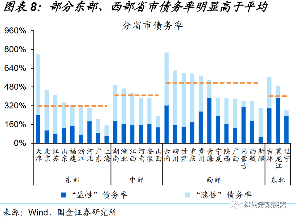 分地區來看,中西部整體債務率相對較高、隱性債務突出,個別東部省市壓力也較大。地方債務持續累積、地方財力相對弱化,使得地方債務壓力逐步凸顯,尤其是西部地區、整體債務率高達500%以上、隱性債務突出,其次為中部,東北、東部整體債務率相對較低。具體省市中,中西部雲南、甘肅、貴州等,東部的天津、江蘇等債務率均高於區域平均水平、尤其是隱性債務壓力或較為突出。