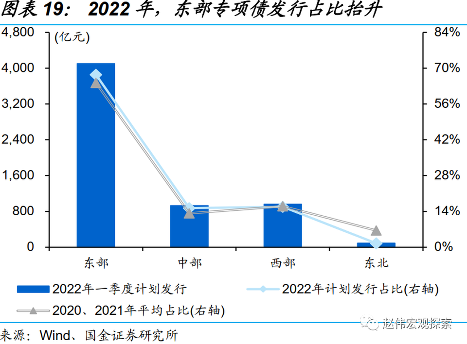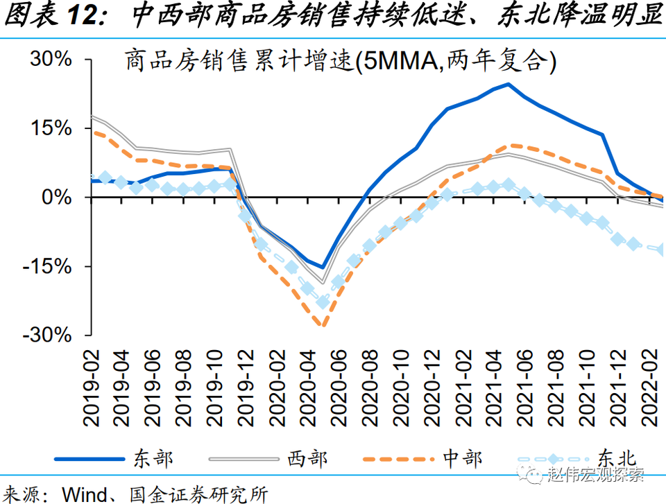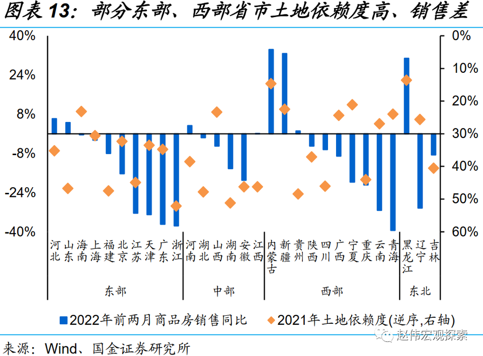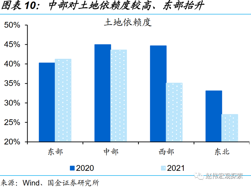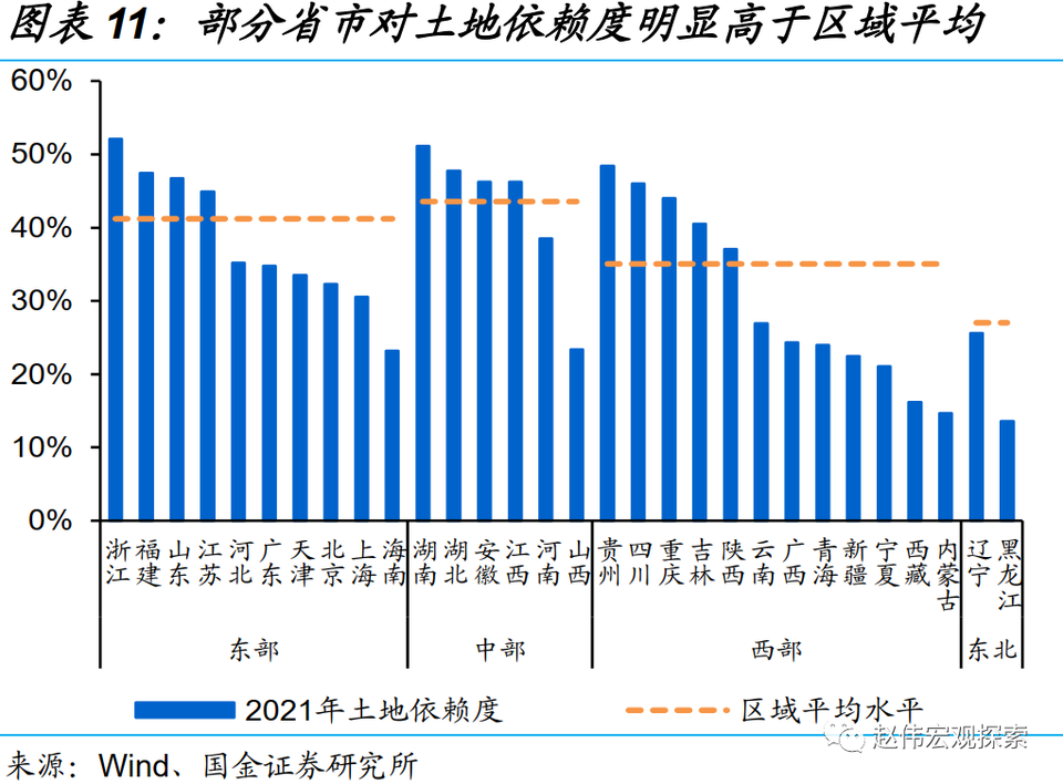 然而土地依賴度較高的部分省市,地產景氣持續低迷,部分中西部、東北省市尤甚。自2021年年中後,部分地區商品房銷售增速加速下滑,東北已連續8個月處於負值區間,中西部也於年底年初紛紛觸及「零增長」,東部年初以來降温顯著。地產景氣度持續走弱、部分對土地依賴度較高的省市或首當其衝,例如,中西部的安徽、湖南、重慶,東北的吉林等。