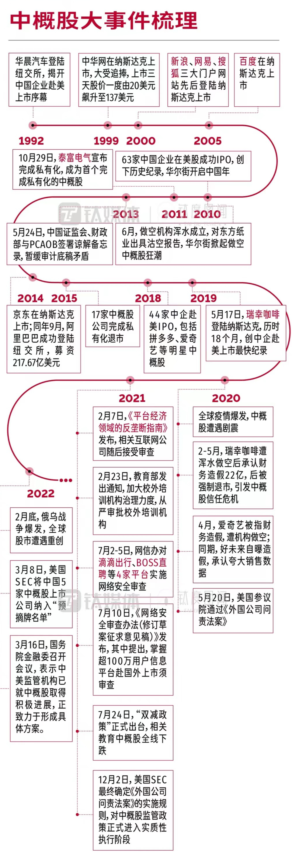 據鈦媒體統計,從1992年到2022年30年間,500餘家中國公司曾赴美上市。這些公司在美股市場創造了「中國概念股」的熱潮,使中概股一度成為美國資本上最活躍的海外市場。