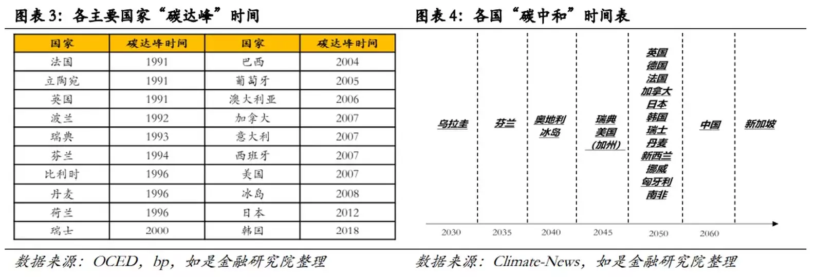 「碳達峰」是二氧化碳排放量由增轉降的歷史拐點,「碳中和」是實現二氧化碳「淨零排放」。碳達峰與碳中和緊密相連,前者是後者的基礎和前提,達峰時間的早晚和峰值的高低直接影響碳中和實現的時長和實現的難度。後者是對前者的緊約束,要求達峰行動方案必須要在實現碳中和的引領下制定。碳中和與碳達峰時間點則代表了一國減排的時間點與決心,也將間接反映該國及減少二氧化碳排放的整體路徑。