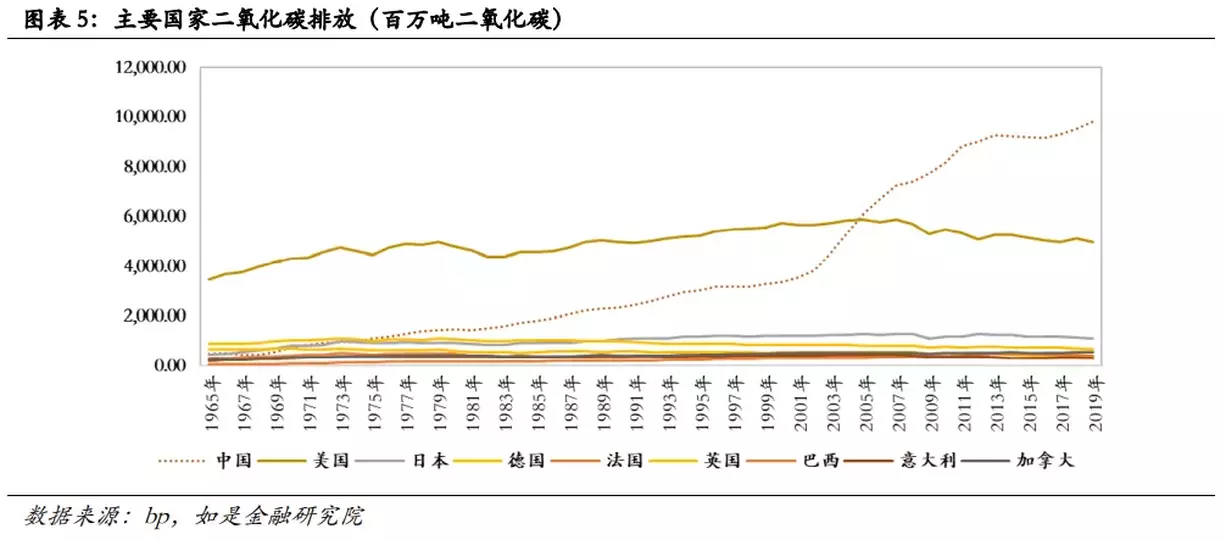 中國「30·60」目標確認,時間緊、任務重。2021年兩會「碳中和」、「碳達峰」上升成為國家重要戰略,中國要力爭二氧化碳排放2030年前達到峰值,力爭2060年前實現碳中和。而如今中國已經是碳排放第一大國,且已經連續13年成為全球最大的温室氣體排放國。根據bp公司數據,2019年中國共計排放二氧化碳98.3億噸,超過了排名第二的美國(50億噸)和第三的歐盟(33.3億噸)排放量之和,佔據全球二氧化碳排放的28%。