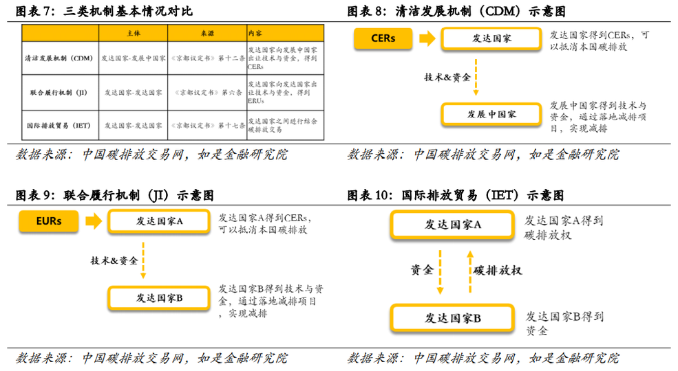 聯合履行機制(JI):意在推動發達國家內部的合作,來自於《京都議定書》第六條。和清潔發展機制(CDM)類似,只不過參與主體從「發達國家-發展中國家」換成了「發達國家-發達國家」。其中一方發達國家在另一方發達國家落地節能減排項目,東道主方得到了資金與技術,出資方得到「減排單位」(ERU)。「減排單位」(ERU)和「經核證的減排量」(CER)性質一樣,僅叫法不同,出資方也可抵消等量的碳排放量。