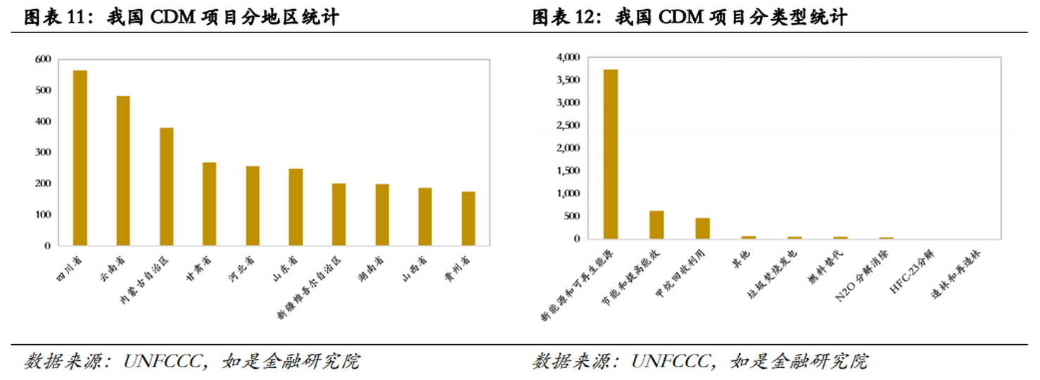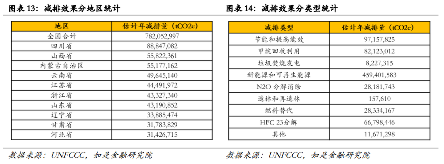 從實際減排效果來看,全國31個省市自治區共計實現減排量(估算年減排量)達7.82億噸二氧化碳當量。UNFCCC將各大CDM項目進行了年減排量預估,並將各類温室氣體的減排轉化為以每噸二氧化碳當量(tCO2e)為計量單位。其中受CDM設立項目影響,四川、內蒙等地效果較為明顯,新能源和可再生能源行業、節能和提高能效行業減排效果明顯。根據UNFCCC官網統計資料,中國通過CDM項目減排效果最為明顯的前十大地區分別為四川省(0.89億噸二氧化碳當量)、山西省(0.56億噸二氧化碳當量)、內蒙古自治區(0.55億噸二氧化碳當量)、雲南省(0.50億噸二氧化碳當量)、江蘇省(0.44億噸二氧化碳當量)、浙江省(0.43億噸二氧化碳當量)、山東省(0.43億噸二氧化碳當量)、遼寧省(0.34億噸二氧化碳當量)、甘肅省(0.32億噸二氧化碳當量)、河北省(0.31億噸二氧化碳當量);通過CDM項目減排效果最為明顯的前三大項目類型分別為新能源和可再生能源(4.59億噸二氧化碳當量)、節能和提高能效(0.97億噸二氧化碳當量)、甲烷回收利用(0.82億噸二氧化碳當量)。