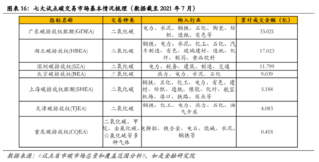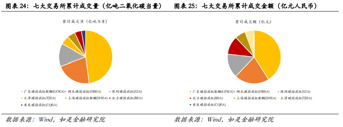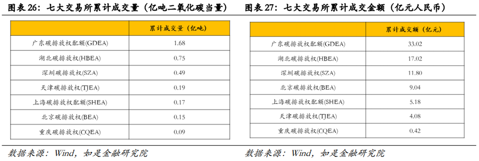 根據七大碳排放權交易所披露的訊息,按累計成交量計算,七大交易所累計成交3.51億噸二氧化碳當量,廣東、湖北、深圳交易規模位列三甲。截止到2021年7月初,當前深圳碳排放權(SZA)交易所、上海碳排放權配額(SHEA)交易所、北京碳排放權(BEA)交易所、廣東碳排放權配額(GDEA)交易所、天津碳排放權(TJEA)交易所、湖北碳排放權(HBEA):交易所、重慶碳排放權(CQEA)交易所累計成交量分別為0.49億噸二氧化碳當量、0.17億噸二氧化碳當量、0.15億噸二氧化碳當量、1.68億噸二氧化碳當量、0.19億噸二氧化碳當量、0.75億噸二氧化碳當量、0.09億噸二氧化碳當量。