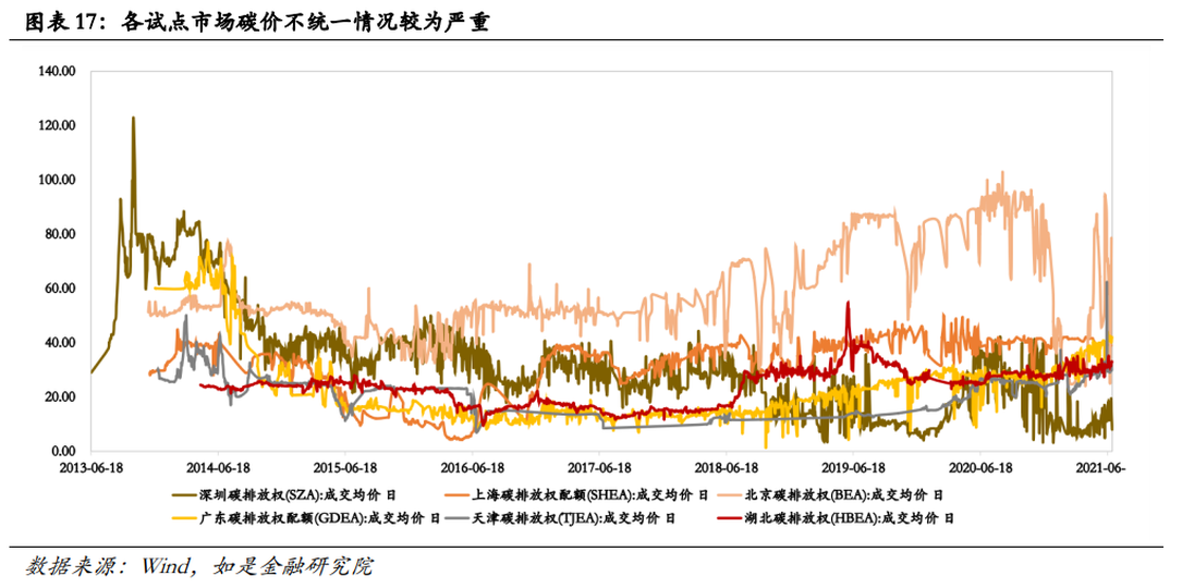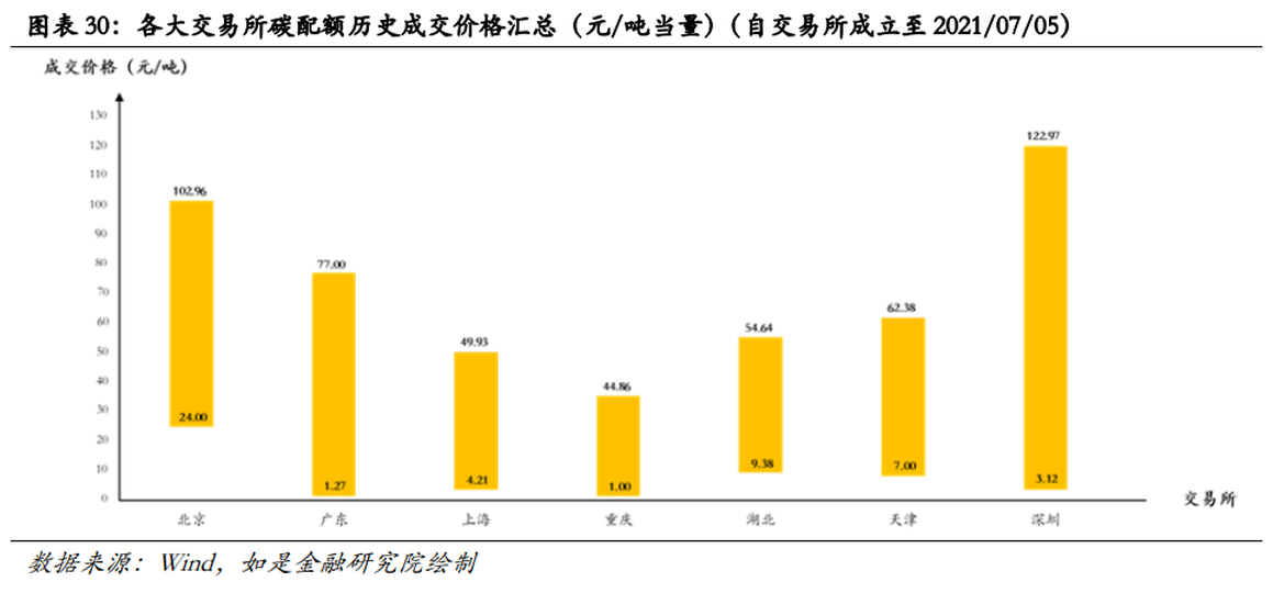 2、碳排放配額(CEA)市場:各地區試點已初具規模,價格分化嚴重