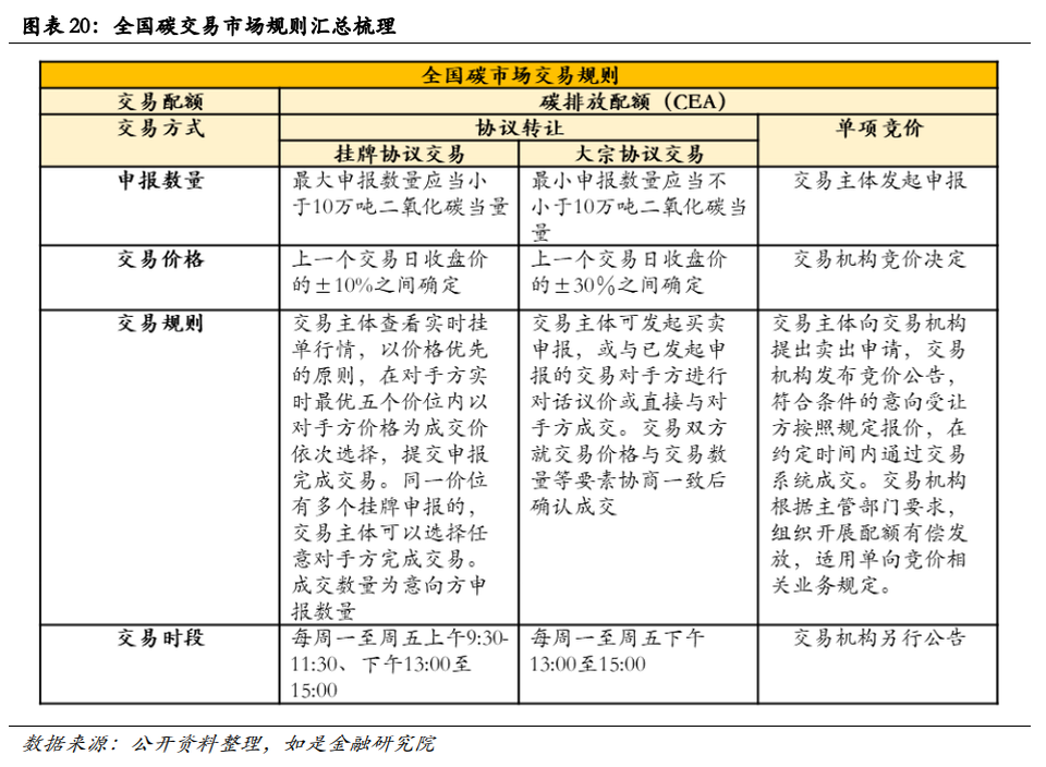 交易時間——與A股基本相同。根據上海環交所發布的《關於全國碳排放權交易相關事項的公告》,全國碳交易市場交易時間與A股基本相同。除法定節假日及交易機構公告的休市日外,採取掛牌協議方式的交易時間為每周一至周五上午9:30-11:30、下午13:00至15:00;採取大宗協議方式的交易時間為每周一至周五下午13:00至15:00。