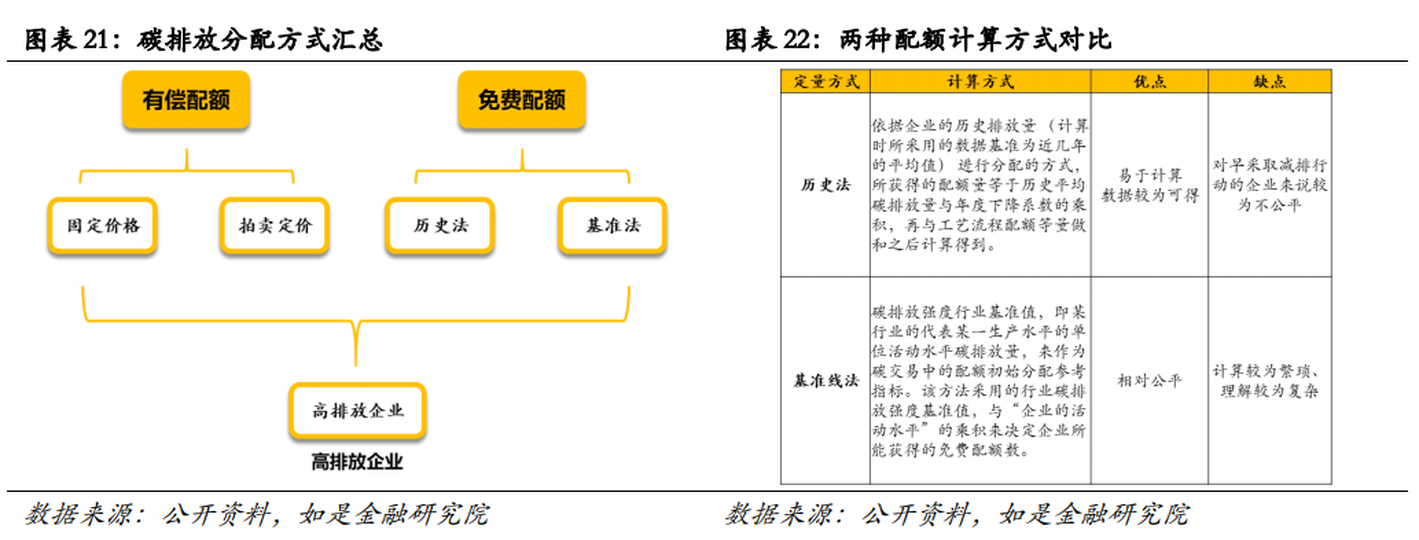 而免費配額即為管理部門直接向高排放企業發放碳排放配額,其分配方式將視不同企業情況而定,常見的配額定量方法有歷史法(也稱為祖父法)與基準法。歷史法(也稱祖父法)是依據企業的歷史排放量(計算時所採用的數據基準為近幾年的平均值) 進行分配的方式,所獲得的配額量等於歷史平均碳排放量與年度下降係數的乘積,再與工藝流程配額等量做和之後計算得到。該方法的優點是理論上易行,對數據要求量相對要小,且計算方法也相對簡單,而缺點則是對早採取減排行動的企業來說較為不公平。基準線法則是以碳排放強度行業基準值,即某行業的代表某一生產水平的單位活動水平碳排放量,來作為碳交易中的配額初始分配參考指標,即基準線。該方法採用的行業碳排放強度基準值,與「企業的活動水平」的乘積來決定企業所能獲得的免費配額數。該方法相對公平,但計算較為複雜。