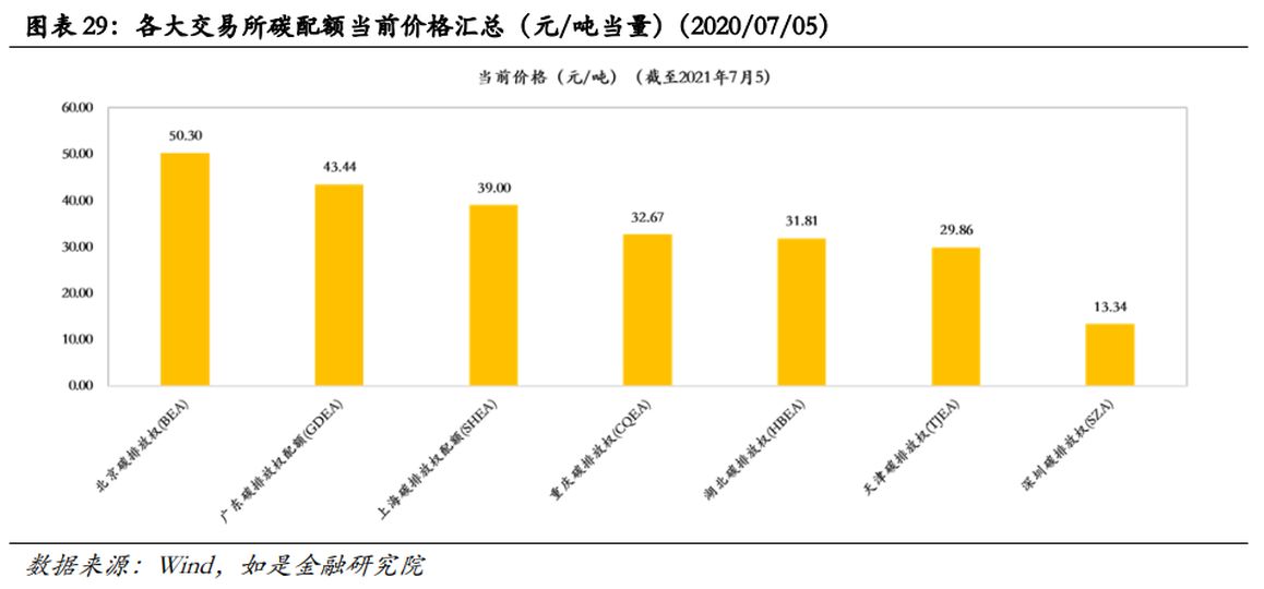 由於各大市場尚未形成聯動,導致單位碳排放價格不統一的現象頻頻發生。針對當前各地碳排放價格不統一現象,我們認為這主要原因在於七大交易所之間尚未形成有機聯動,並且各大交易所涵蓋的交易主體不同,各個交易所之間碳排放配額供給需求均有較大差別,導致了各地對於碳排放配額的估值產生了差異。