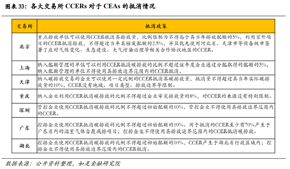 但若僅有強制性的配額(CEA)市場,則只能鞭策高排放企業減排,並沒有對低排放企業進行「獎勵」,CCER市場可作為對低碳企業的補充獎勵而設立。僅有強制性的配額(CEA)市場並不能激起節能減排行業企業減少碳排放的主觀能動性。而自願減排交易(CCER)市場上和強制性的配額(CEA)市場略有不同。具有低碳屬性的企業可以向相關部門遞交自願減排交易申請,將公司內部項目申報為CCER項目。一旦成功申請下CCER項目,則可以獲得中國核證減排量(CCERs)。核證減排量(CCERs)可以用於抵消其不超過5%的二氧化碳排放量。如今中國七大市場中換算方式均為1單位核證減排量(CCERs)可抵消1噸二氧化碳當量的排放量。