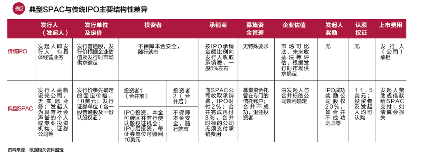總的來看, SPAC在制度設計上不僅主動響應監管要求,而且兼顧了各參與主體的利益訴求:對IPO投資者來說,它保障了投資本金安全,除普通股外,投資者還可以從認股權證獲得低價入股的套利機會。此外,SPAC 可以在市場上交易,滿足了投資者特別是機構投資者對證券流動性的要求。對資金量比較少的個人投資者來說,提供了參與門檻較高的私人股權投資基金的機會;對併購標的企業來說,它是非常乾淨的殼資源,那些初創期企業、創新型企業以及不符合IPO要求的企業可以通過SPAC繞過IPO嚴格而又較為煩瑣的審核程序,實現低成本的快速上市;對發起人來說,一旦併購成功,它在IPO中獲得的20%股權獎勵及認股權證等都可能帶來數十倍甚至千倍以上的鉅額收益;對承銷商來說,儘管要分期收款,但在迅速擴大IPO市場佔有率的同時還有後續的做市及併購等業務,綜合收益並不低,不僅如此,承銷商還可以自己做發起人獲取鉅額收益。