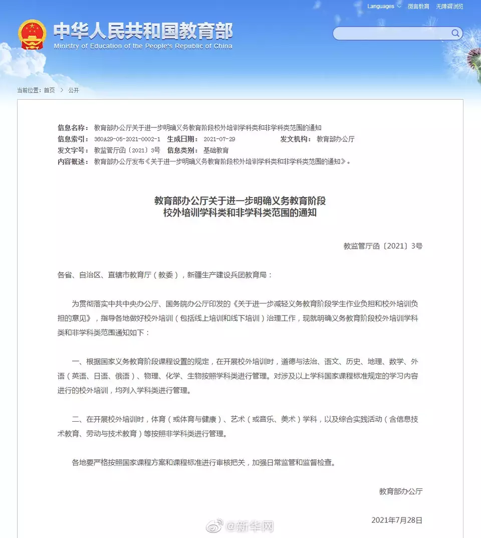 7月30日午間,教育部辦公廳發布關於進一步明確義務教育階段校外培訓學科類和非學科類範圍的通知。