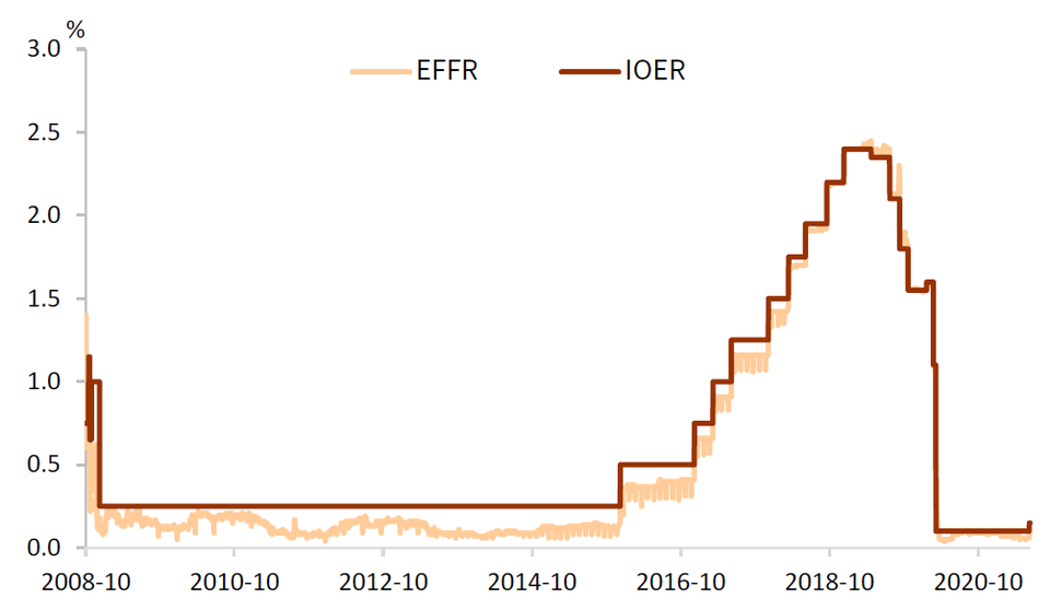 然而實際上,金融危機後,IOER對機構的資質有要求。FHLBs和GSEs等無法享有準備金利息的機構成為聯邦基金市場上主要的融出方,使得理論下限失效。後QE時期,美聯儲負債端的準備金規模和財政部賬户(TGA)餘額迅速增加(圖表12),銀行體系準備金充裕,截止2021年6月,美聯儲的準備金餘額約為3.5萬億美元,佔其總資產規模的44%(圖表13)。充裕的準備金環境下,銀行在聯邦基金市場借入準備金的意願有所降低。然而FHLBs、GSEs以及貨幣市場基金等非銀金融機構等無法獲得IOER的機構願意以低於IOER的利率融出美元,這使得銀行體系在聯邦基金市場上的套利動機上升(主要參與者是外國銀行在美分支機構),賺取IOER-EFFR的利差。EFFR突破了IOER的理論下限,而在絕大多數時間,IOER反而成為EFFR的利率頂(圖表14)。
