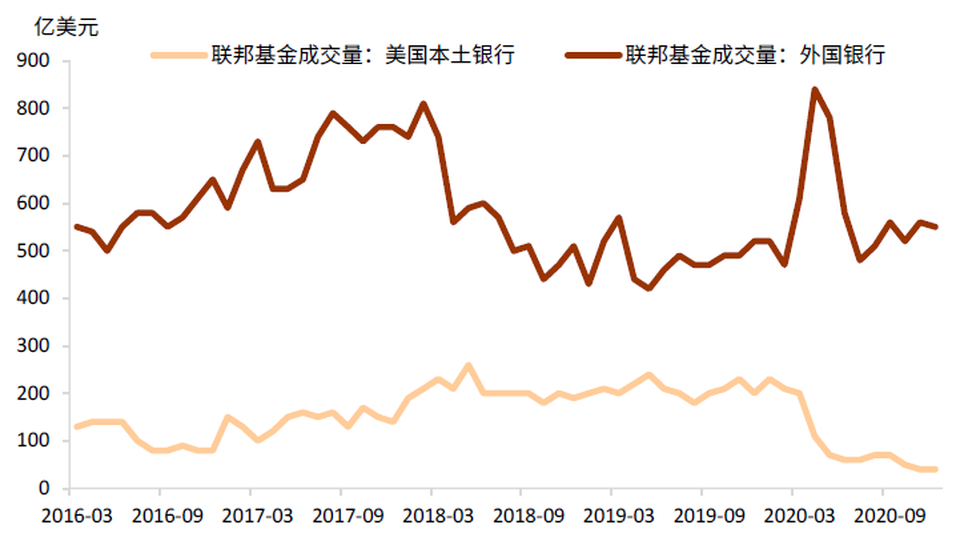 美國貨幣市場主要可分為聯邦基金市場和回購市場,這兩個市場最為靠近美元流動性創造的核心,也是美聯儲可通過調整交易對手方範圍直接參與的市場。聯邦基金市場為無擔保的短期拆借市場,主要供美國商業銀行之間拆借準備金,交易利率為聯邦基金利率(EFFR)。主要參與方包括美國本土銀行、外國銀行在美分支機構(Foreign Banking Organizations, FBO),以及政府支持企業(Government Sponsored Enterprise, GSEs),如聯邦住房貸款銀行(FHLBs)和「兩房」(房地美、房利美)。從交易量來看,金融危機之後,聯邦基金市場的整體交易規模萎縮,充裕的準備金使得商業銀行對聯邦基金的需求減少,QE1-QE3期間,聯邦基金市場的日成交量約為450億美元,而2008年以前,日均成交量超過1000億美元(圖表2)。金融危機之後,市場的主要參與者也發生了變化。FHLBs和GSEs等無法享有準備金利息的機構成為聯邦基金市場上最大的融出方,而FBO成為該市場最大的融入方(圖表3),2020年以來,FBO的交易量佔聯邦基金交易總量的比重持續上漲至當年年末的93%。