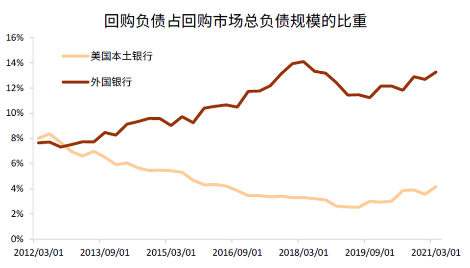 美國回購市場的負債規模於2008年達到歷史高位5.1萬億美元,金融危機期間急劇下降,於2009年12月降至3.1萬億美元。金融危機後,回購市場負債恢復增長,截止2021年3月,回購市場的負債規模約為4萬億美元(圖表5)。經紀交易商是回購市場最主要的負債方,然而其回購負債佔整個回購市場負債的比重由2010年初的58%持續下降,截止2021年3月,該佔比約為39%。包括對沖基金、信用聯盟、保險機構等其他各類參與者的回購負債佔市場總負債的29%。銀行的回購負債佔回購市場負債的比重上升,由2010年初的5%上升至今年3月的17%,主要源於外國銀行負債端的回購上升(圖表6),這意味着銀行體系對短期融資的依賴度有所加大。美國回購市場的資產約為4.5萬億美元,經紀交易商同樣是回購市場上主要的投資者,其回購資產佔回購市場總資產的27%,其次為貨幣市場基金,該佔比為23%,銀行的回購資產約佔回購市場總資產的13%。經紀交易商是三方回購市場中重要的中央交易對手,因而同時佔有較高的回購資產和負債份額,這也意味着,流動性緊張時期,貨幣市場基金和經紀交易商將承受較大的擠兑壓力。