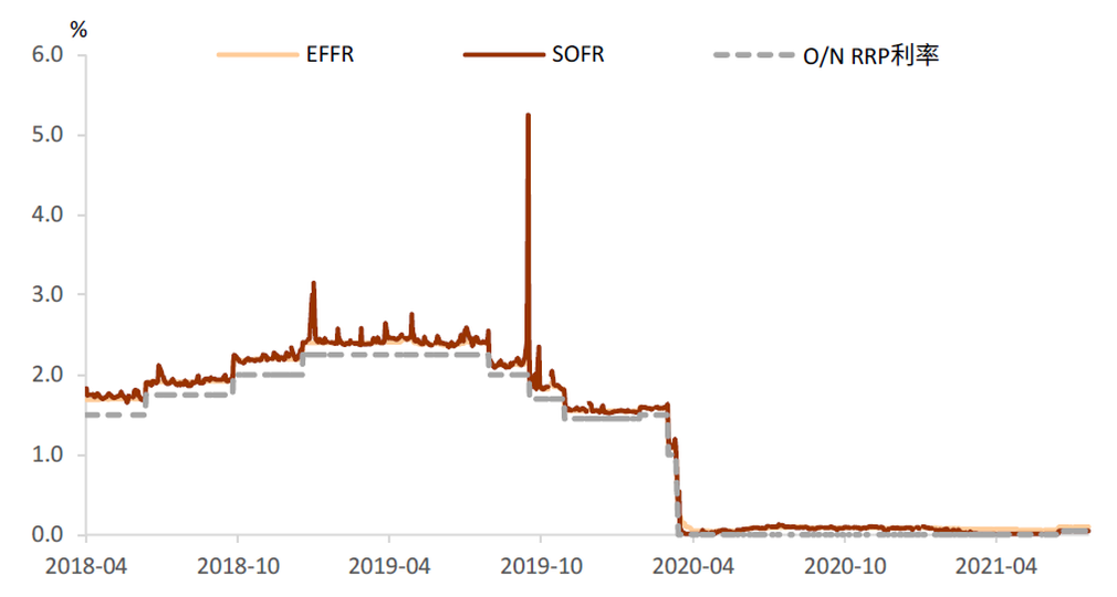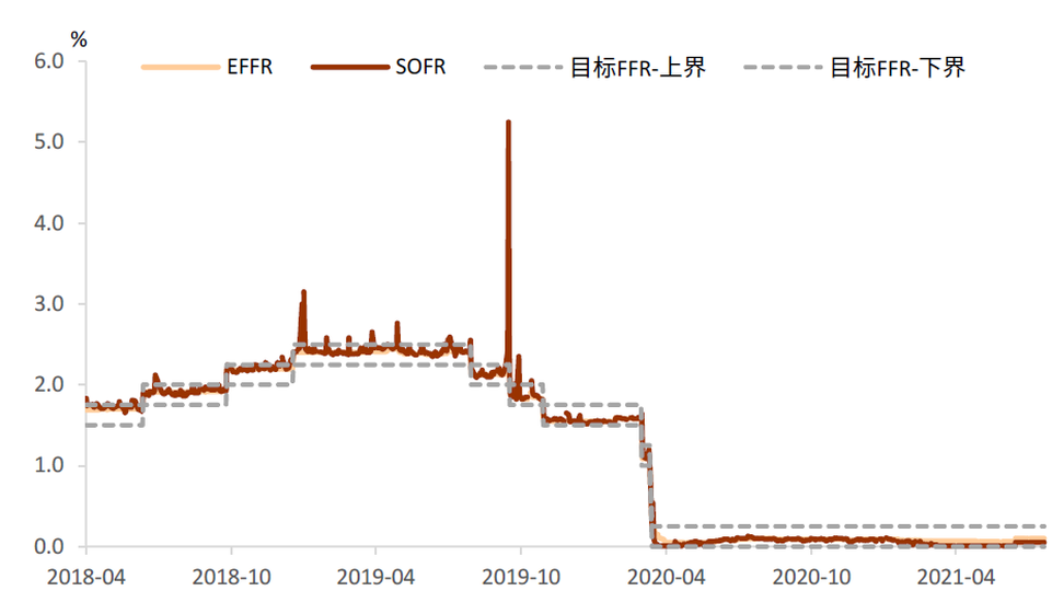 然而IOER是流動性充裕時期聯邦基金利率的實質上限,其既不是EFFR的理論上限,亦不是整個貨幣市場的利率上限。在美元流動性緊缺時期,貨幣市場利率會突破IOER利率。例如,2019年9月中旬的貨幣市場動盪時期,SOFR於9月17日飆升至5.25%,EFFR也同時突破了IOER利率和聯邦基金利率的目標上限,達到2.30%。美聯儲於2021年7月28日推出了常備回購便利(Standing Repo Facility, SRF)工具,該工具的交易對手方為一級交易商,自10月1日起,符合一定條件的銀行也將被納入。SRF工具使得交易對手方能夠隨時以國債、機構債和機構MBS等抵押品向美聯儲融入美元,利率不低於美聯儲規定的利率,實際成交利率將以規定的量為基礎,綜合各需求方的報價利率。
