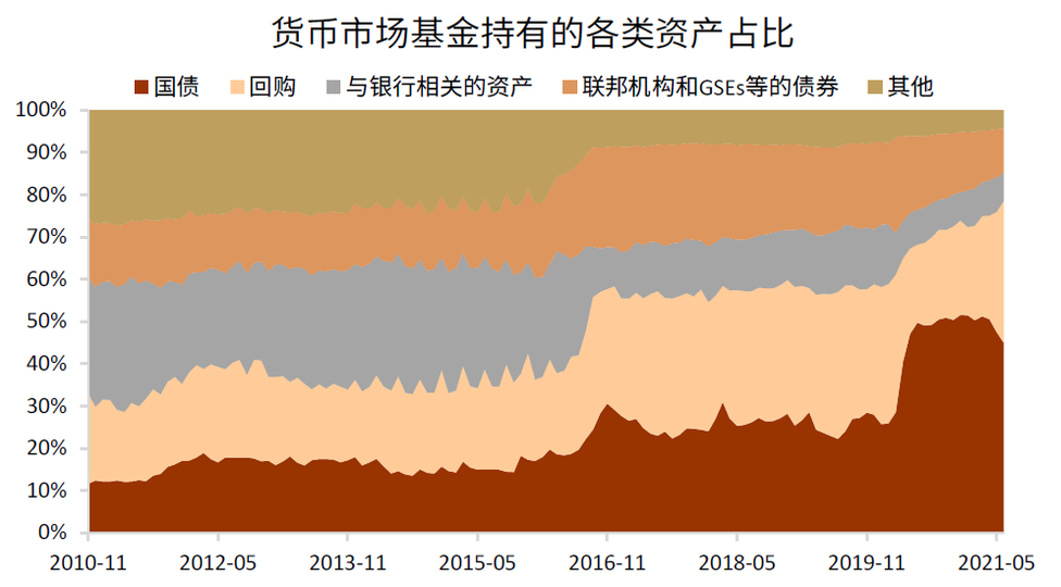 其次,貨幣市場基金連接了最終資金提供方和最終資金需求方。圖表8展示了貨幣市場基金在短期融資市場中的位置、資產規模、及其與各市場參與者之間的聯繫,不難看出,貨幣市場基金是連接資金需求方和供給方的重要橋樑。圖表8左側為借方,右側為貸方,信用風險從左向右流動,資金從右向左流動。在最右側,家户是貨幣市場基金最主要的負債來源,企業也將多餘的美元投資於貨幣市場基金;在圖表8的左下方,金融機構通過貨幣市場基金管理其流動性需求,例如追加保證金和應對贖回等;在圖表8的左上方,FHLBs和GSEs等機構主要通過貨幣市場基金融資,貨幣市場基金還持有大量美國國債為聯邦政府提供融資。截止2021年6月,貨幣市場基金持有的美國國債約為2.3萬億美元,主要是短期美債,佔其資產總規模的45%。其次是回購協議,約為1.7萬億美元,佔其資產總規模的34%(圖表9)。FHLBs和GSEs等機構的對貨幣市場基金的負債於2020年3月達到高點,約為1萬億美元,此後有所下降,截止2021年6月,降至0.5萬億美元。