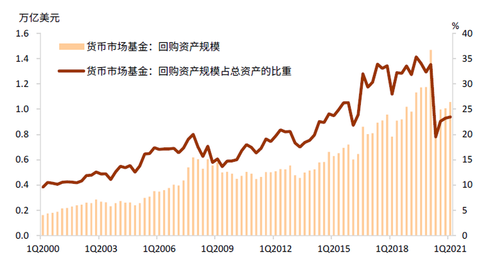 最後,貨幣市場基金是美元流動性傳導的樞紐,其資金流變化反映和影響着美元體系的流動性。家户、企業等主要資金提供方投資於貨幣市場基金,使得貨幣市場基金成為最主要的現金池,其資金進一步地主要通過回購市場流向經紀交易商,再通過經紀交易商流向對沖基金、抵押型房地產信託投資基金、FHLBs和GSEs等機構、以及有流動性管理需求的銀行。在一環又一環的傳導下,美元通過貨幣市場基金滲透到資本市場的各角落。圖表10表明,金融危機後,貨幣市場基金作為融出方佔回購市場的份額持續上升,截止2021年3月,貨幣市場基金的回購資產規模約為1.1萬億美元,佔整個回購市場資產規模的23%(圖表11)。這也意味着,當市場處於壓力期對流動性的需求上升時,貨幣市場基金將首當其衝受到擠兑,壓力緊接着傳導到經紀交易商,再傳導到銀行體系。貨幣市場基金在正常時期是美元流動性傳導的樞紐,而在危機時期成為金融市場流動性衝擊的源頭。