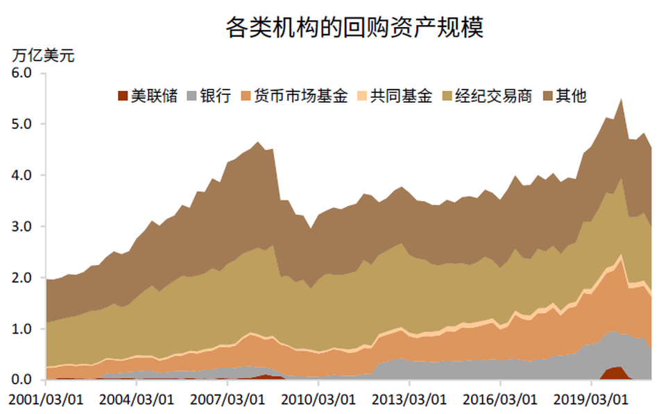 如何理解在美聯儲正常擴表期間流動性的結構性收緊?貨幣市場是關鍵。美國貨幣市場主要可分為聯邦基金市場和回購市場,這兩個市場最為靠近美元流動性創造的核心。貨幣市場基金的規模龐大,是短期投融資市場的重要參與者。金融危機後,貨幣市場基金成為美元流動性傳導的樞紐,其資金流變化直接反映和影響着美元體系的流動性。近期隔夜逆回購激增,貨幣市場基金便是重要推手。所以探究貨幣市場的主要參與者和運行邏輯有助於我們判斷短期內流動性的結構變化。