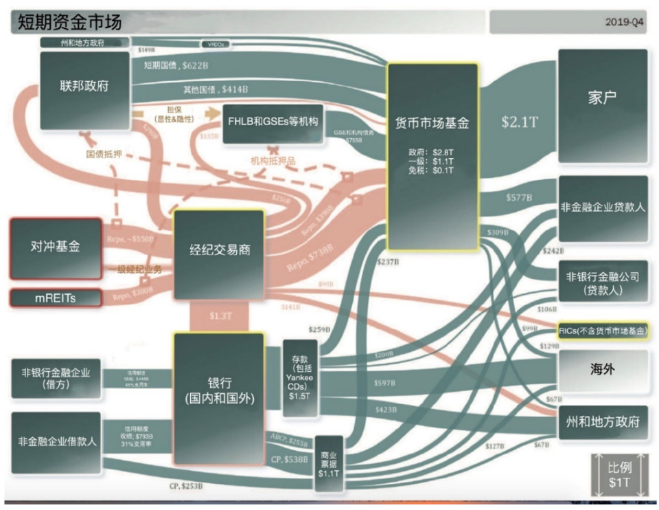 作為全球貨幣,整個美元流動性體系的複雜毋庸置疑,美元市場的層級、信用擴張方式、參與者主體、融資能力等隨監管要求不斷變化。在本文中我們不試圖去描繪美元流動性體系的完整圖景,而是強調在美元流動性的傳導鏈條中,需關注貨幣市場基金的樞紐地位。