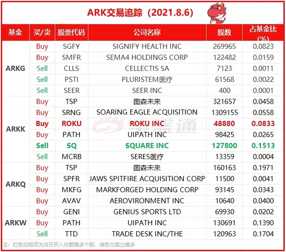 ARK8月6日共有18筆交易,較前幾日成交筆數顯著減少,上周五,ARK繼續買入流媒體領導者Roku和其長期看好的圖森未來。