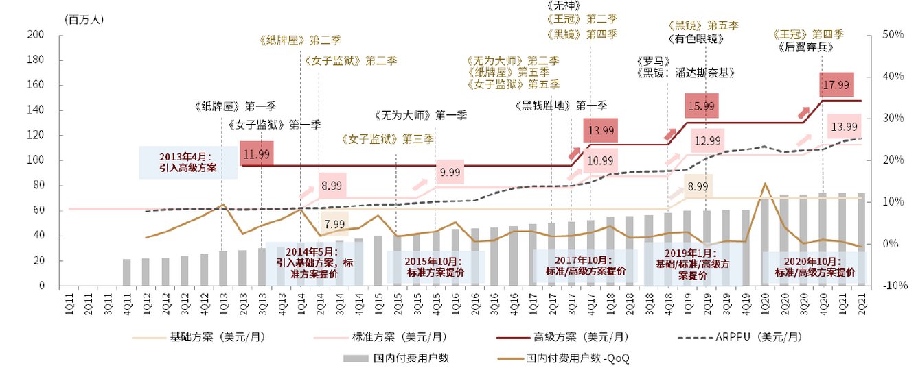 先後五次提價,會員增速相對穩定、ARPPU穩步抬升。公司先後於2013年4月、2014年5月引入高級和基礎方案,並對美國會員費用共進行五次提價。經歷數次提價後,美國國內會員ARPPU已由2012年接近基礎方案7.99元的水平逐步提升至2020年接近標準方案13.99元的水平。雖然經歷了多次漲價,但Netflix用户對平台忠誠度仍然較高,過半用户對於漲價預期持接受態度。我們認為優質獨播內容培養用户粘性,降低了用户需求價格彈性;季播模式和寬鬆審查環境保證內容批量準時上線,滿足了觀眾付費的心理預期;不同套餐提價幅度不同、對老用户延遲生效,產生兜底緩衝作用。