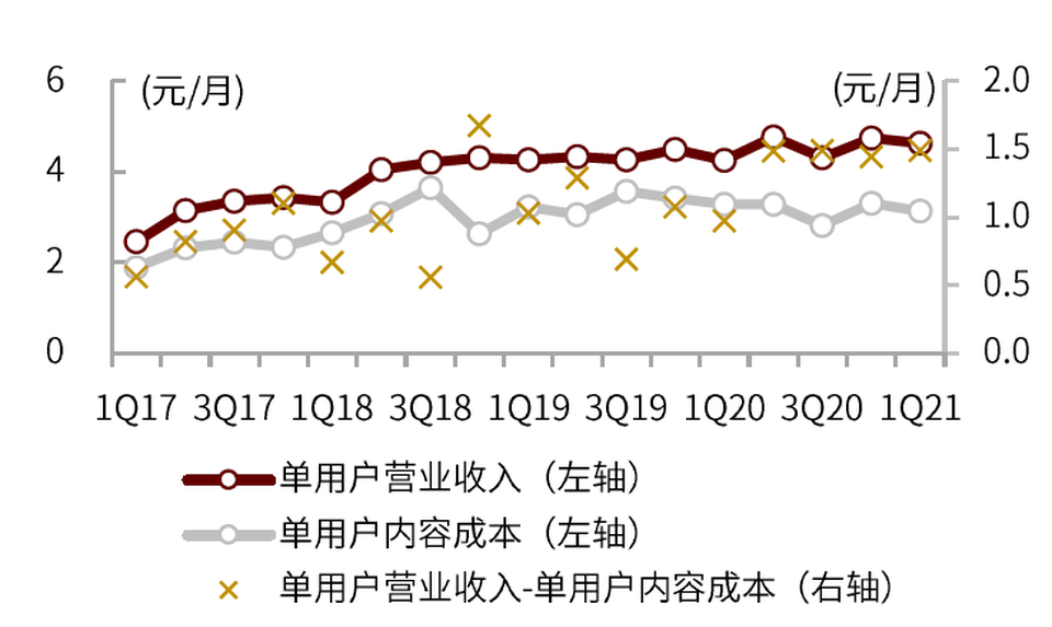 成本控制逐步加強,但受攤銷期影響規模效應尚未顯現。經過國家政策規範以及行業加速出清,中國視頻平台內容採購成本日益回歸理性。據《證券日報》2019年6月報道[5],有資深製片人表示大平台採購價已經平均縮水超過60%,愛奇藝CEO龔宇表示平台內容製作成本和採購成本均明顯下降,電視劇版權成本從最高超1,500萬元/集回落到800萬元/集以下。雖然如此,愛奇藝用户營業收入與內容成本之差亦尚未體現出提升趨勢,我們認為主要由於庫存內容仍需一定消化期,部分前期採購的高成本劇集因出貨不及時、觀眾偏好變化而出現積壓,未能按計劃播出,因而規模效應尚未體現。
