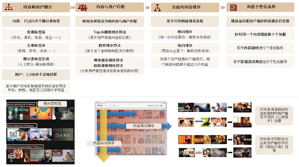 ►內容和用户細分:Netflix結合已有的數據積累構建了擁有約77,000個分類的「微標籤」數據庫實現內容細分,並將用户劃分成近2,000個動態變化的「品味社群」,從而為用户提供更加個性化的視聽體驗。