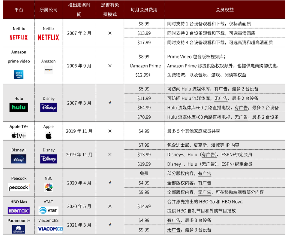 圖表:全球主流SVOD視頻流媒體平台價格及權益對比