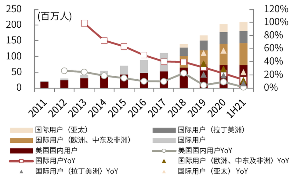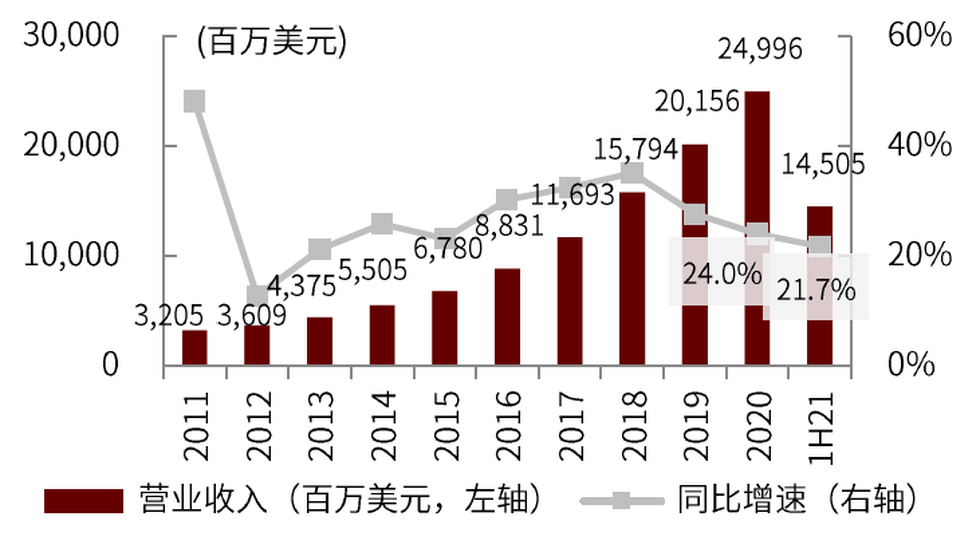 圖表:Netflix 2011~1H21營業收入:2019年起有所回落