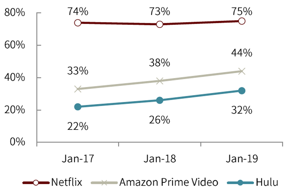 圖表:Netflix對美國OTT家庭滲透率位居高位