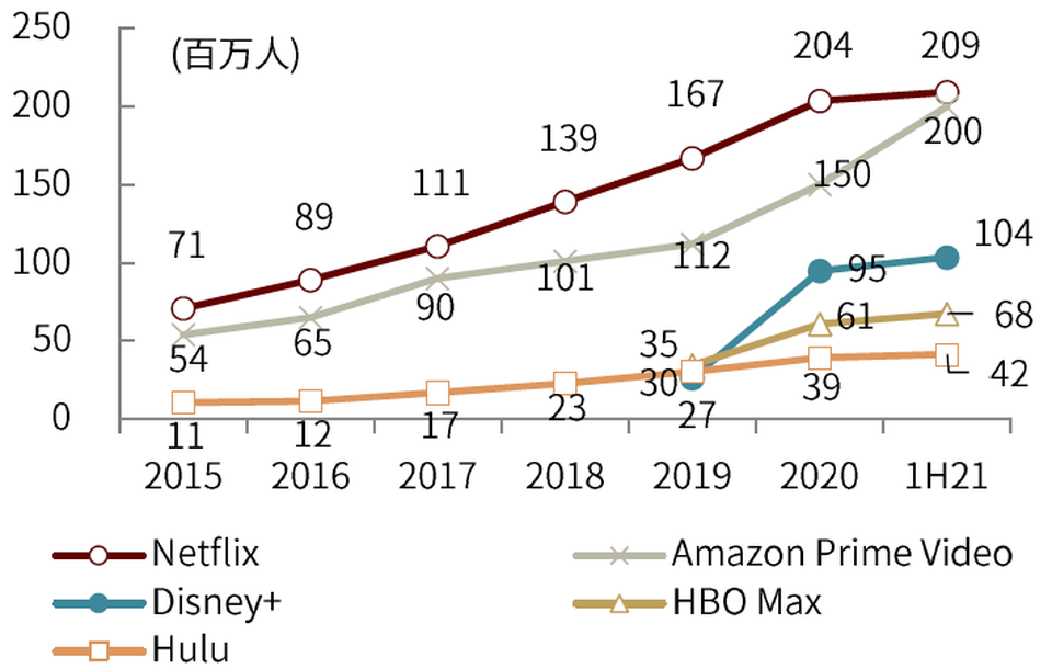 用户規模維持首位,播放份額和使用時長保持行業領先。截至2Q21Netflix以2.09億付費會員規模保持行業首位,2017-2019年對OTT家庭滲透率始終超過70%,較競爭對手明顯領先。從內容表現上看,Netflix 2021年在美國電視流媒體中使用時長中排名第一,體現了平台內容對用户相對較高的吸引力。