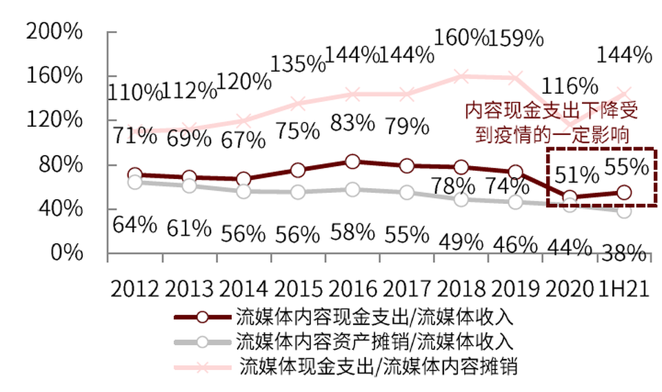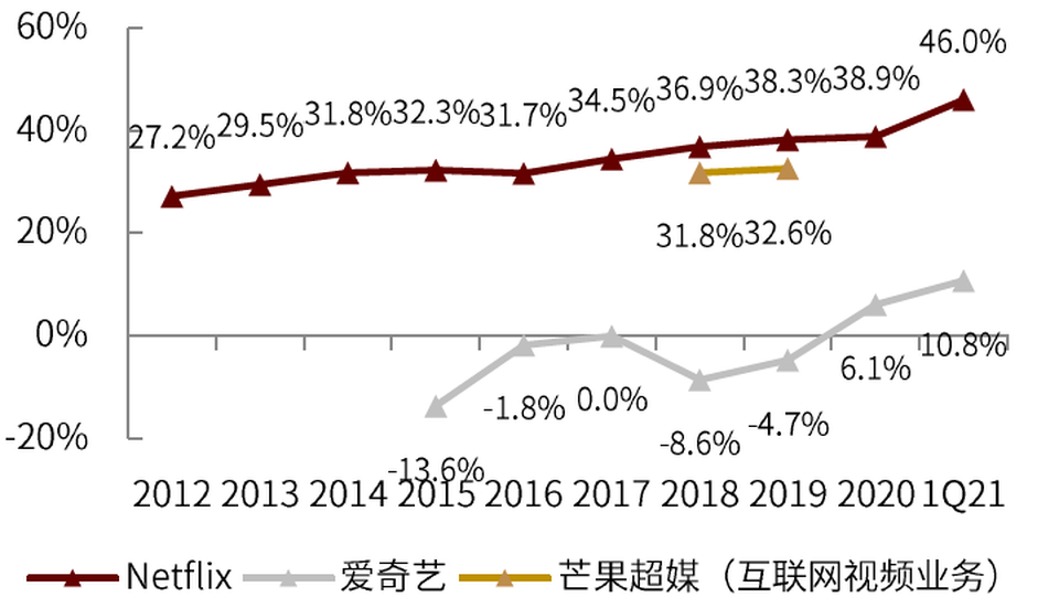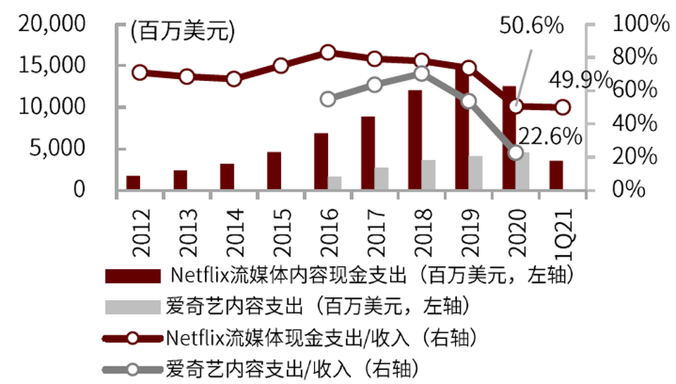 國內公司內容現金支出金額低於海外,但由於攤銷政策及內容結構差異導致毛利率較低。愛奇藝2020年用於內容投入的現金支出約為45.5億美元,不到Netflix的40%;但從毛利率角度看,愛奇藝毛利率相對較低,在2020年首度轉正;芒果超媒網路視頻業務毛利率則與Netflix相近。我們認為不同公司毛利率的差別一方面由於攤銷政策存在差異,另一方面各平台內容來源的不同也帶來收入成本結構的差異:Netflix更多進行內容自制、項目成功率和風險相對可控;愛奇藝在版權內容採購方面具備一定規模優勢,同時逐步增加自制內容份額,優化成本結構;芒果超媒自制和採購並舉,但由於注重成本控制、依託湖南台資源,內容成本相對較低。